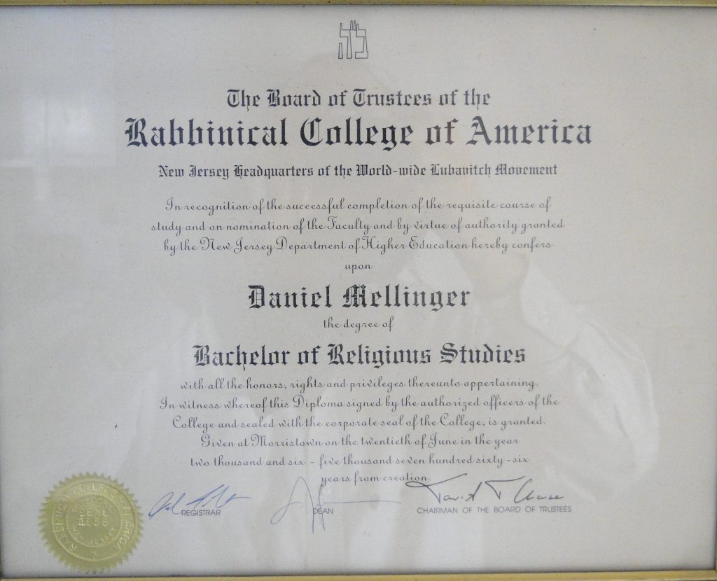 Graduated inTalmudic Studies at the Rabbinical College of America in 2010, and received Rabbinic ordinance by the Dayan Rabbi Nechamiah Goldberg Z”L